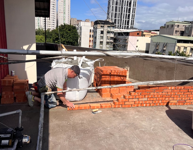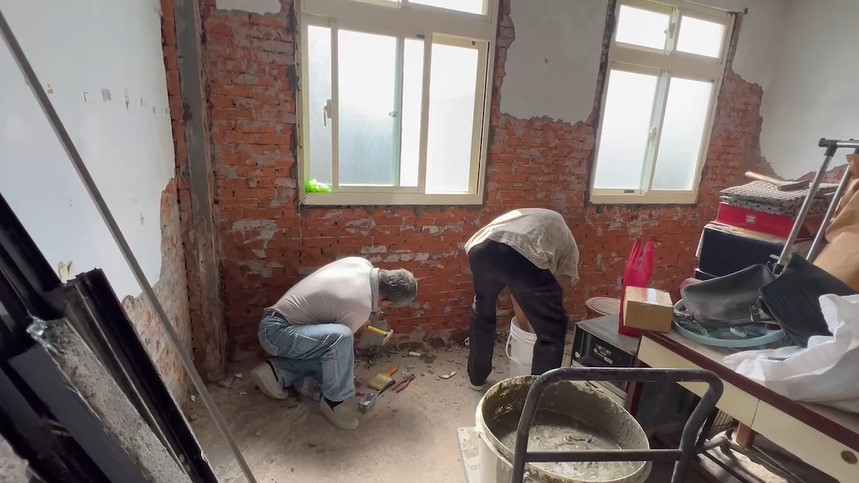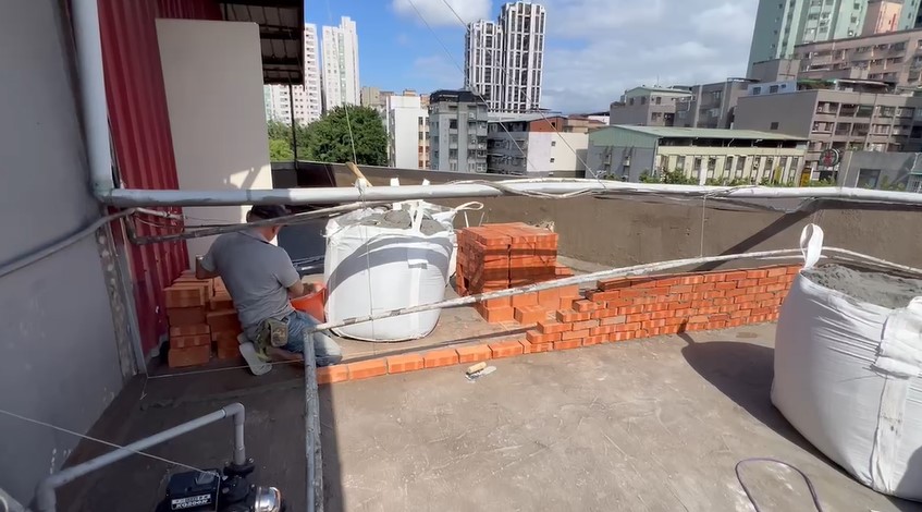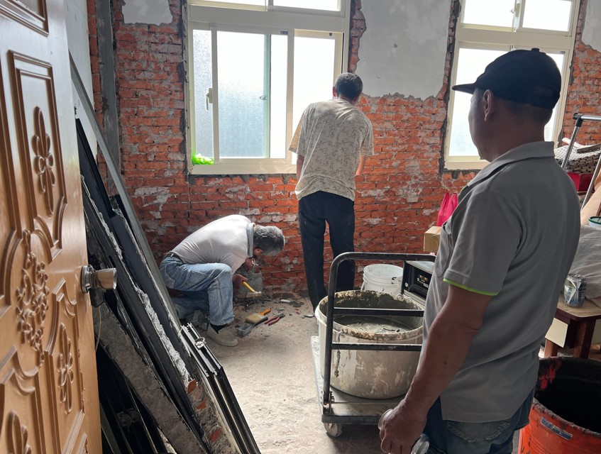 牆壁及屋頂泥作沏磚塊工程和泥作粉光工程,包含了建築結構的基礎建設及表面處理。牆壁和屋頂的沏磚塊工程是構築牆體及屋頂的核心施工過程,先使用紅磚等材料按設計圖進行施工,再將水泥砂漿塗抹在磚塊縫隙中,並加鋼筋以確保穩定性。屋頂施工時,特別注意防水與排水坡度的設置,以避免滲水問題。