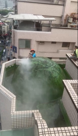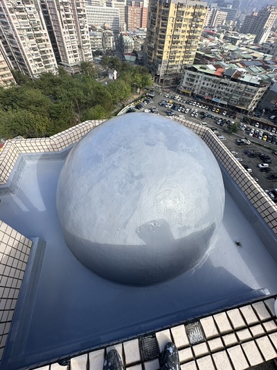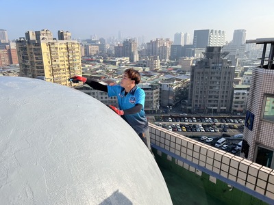 先用高壓水柱清洗外牆及圓頂部分.洗淨後塗上防水漆.整體煥然一新.免受漏水困擾