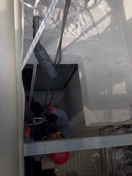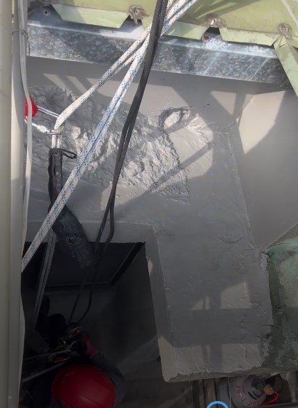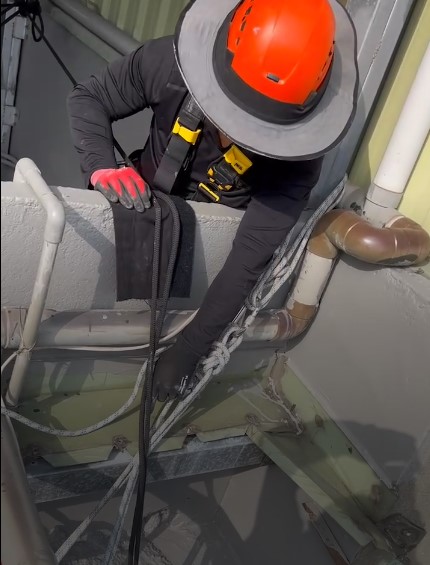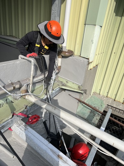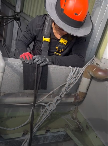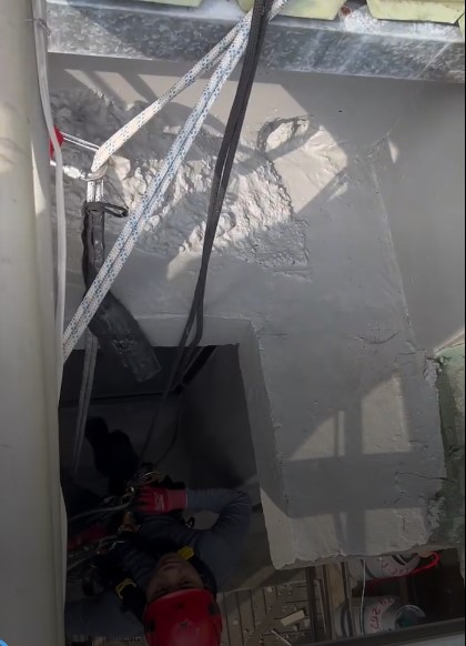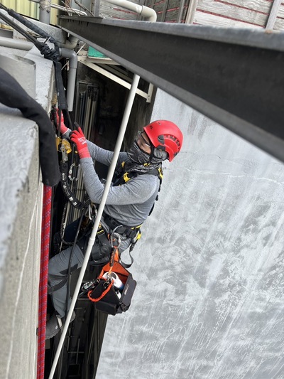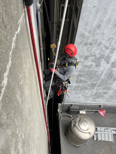 由於施工空間受限,抓漏魔術師-張家豪團隊採用了專業吊掛設備進行作業,確保施工人員的安全與效率。防水處理過程中,使用了高效且耐久的防水材料,含專業矽利康填縫劑與防水塗料,全面封堵裂縫並加強牆面結構的防水能力。此外,針對大樓特殊的結構與外牆材質,量身訂製防水方案,確保工程效果持久。