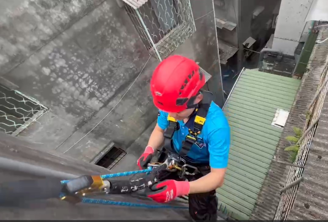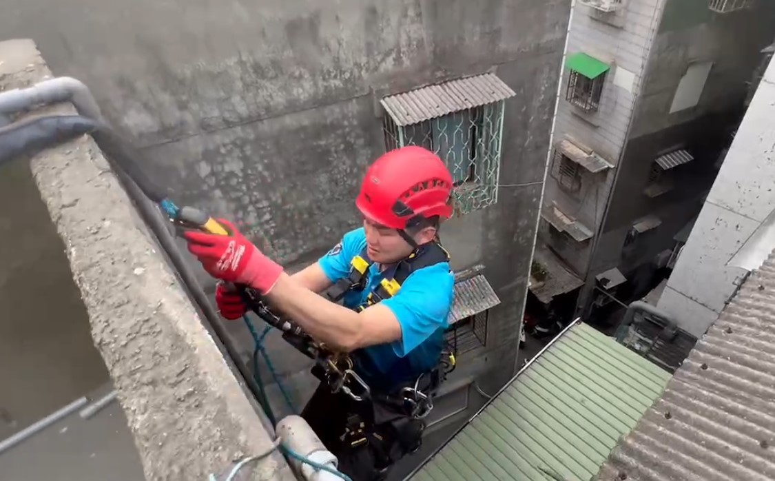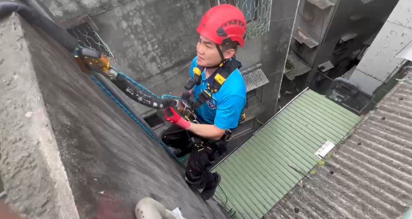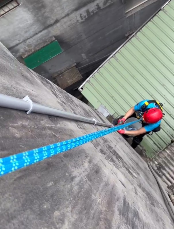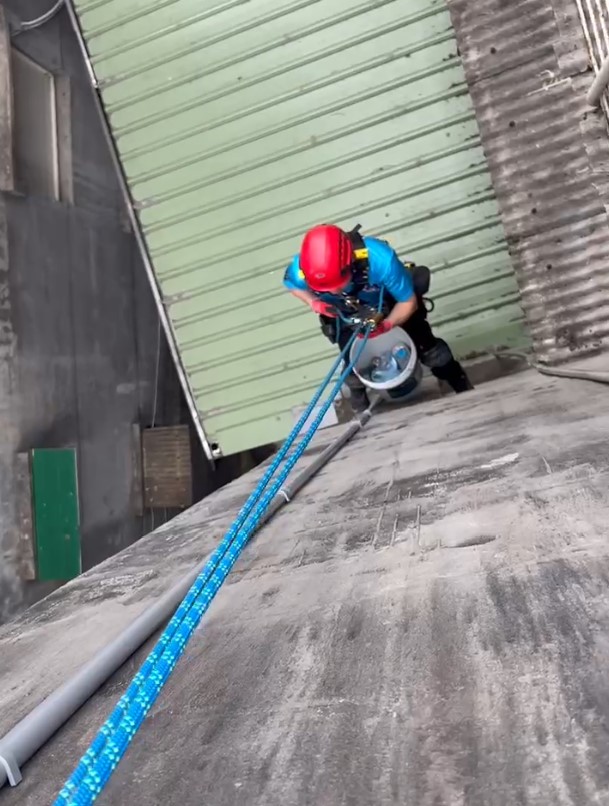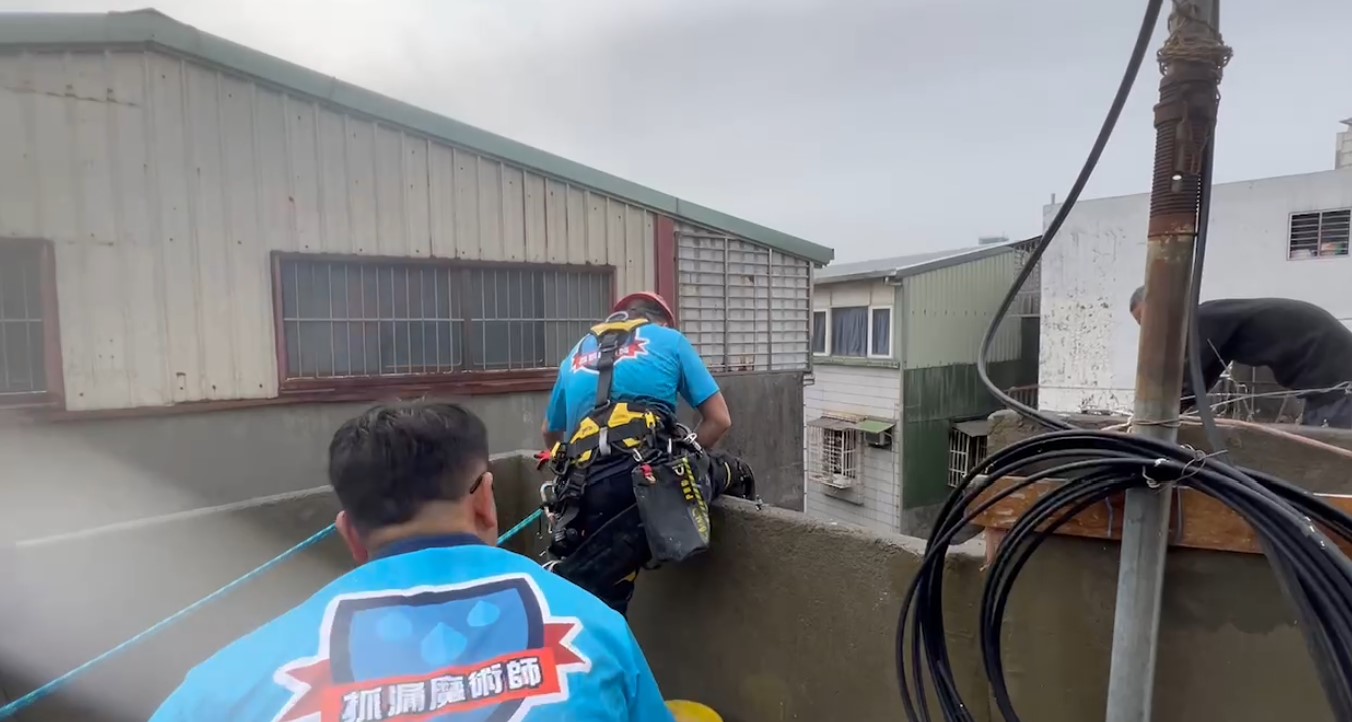 由於施工高度超過數十公尺,傳統鷹架不適用,因此我們採用「蜘蛛人」方式,讓經驗豐富的抓漏師傅身繫安全繩,垂降到大樓外牆,逐步進行防水工程。