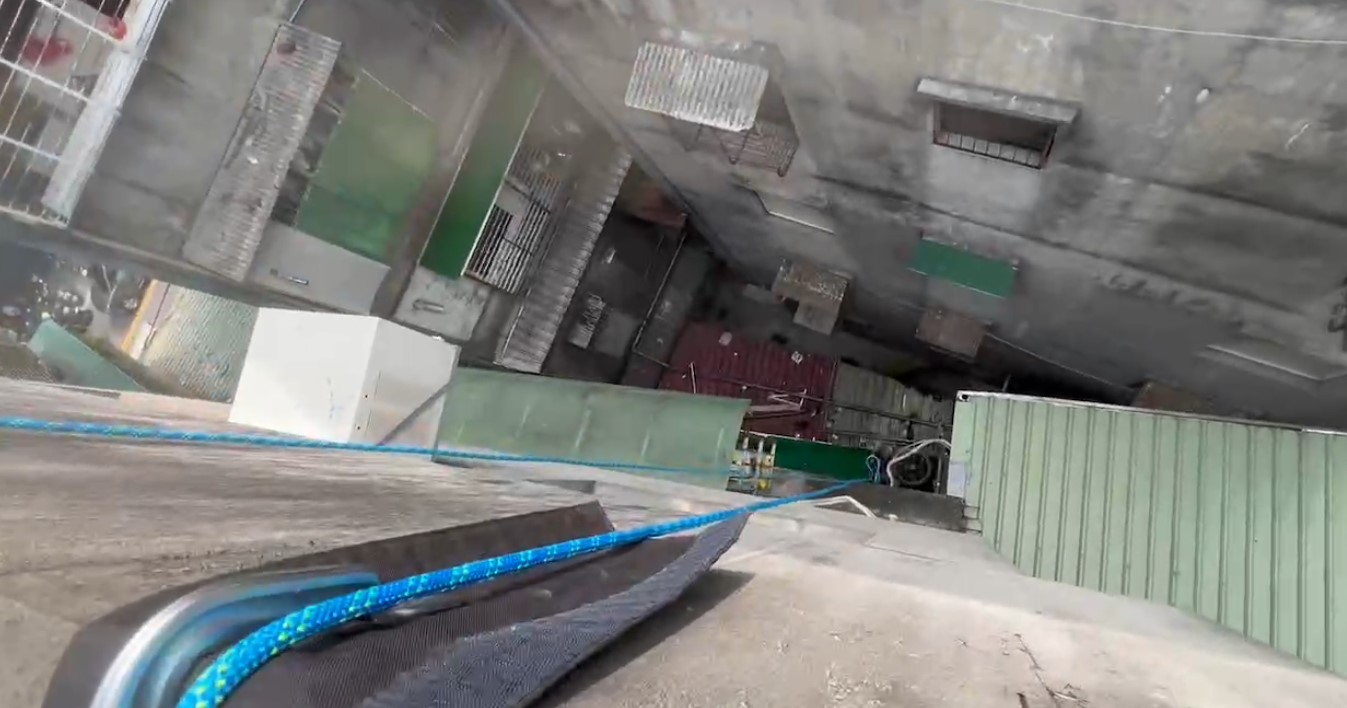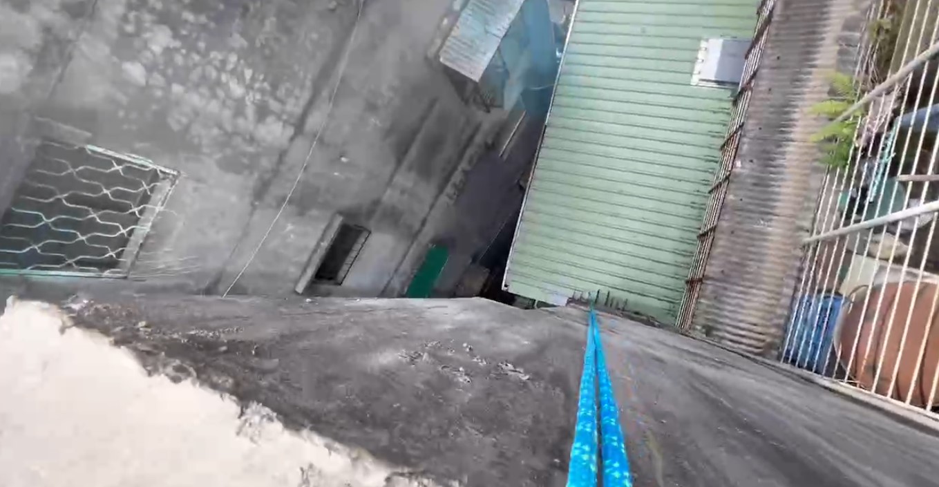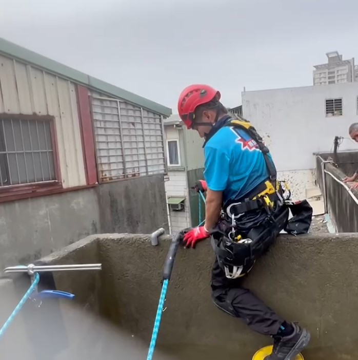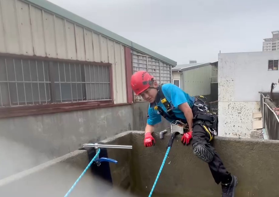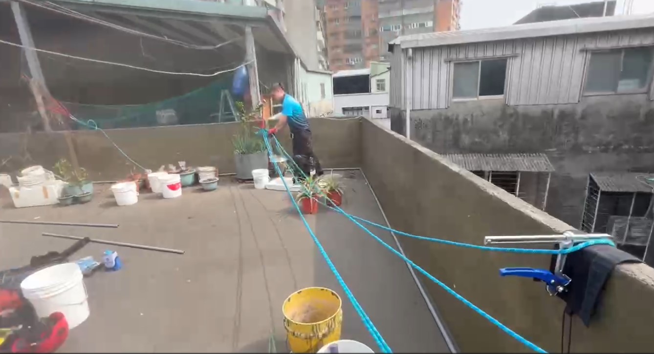 由於施工高度超過數十公尺,傳統鷹架不適用,因此我們採用「蜘蛛人」方式,讓經驗豐富的抓漏師傅身繫安全繩,垂降到大樓外牆,逐步進行防水工程。