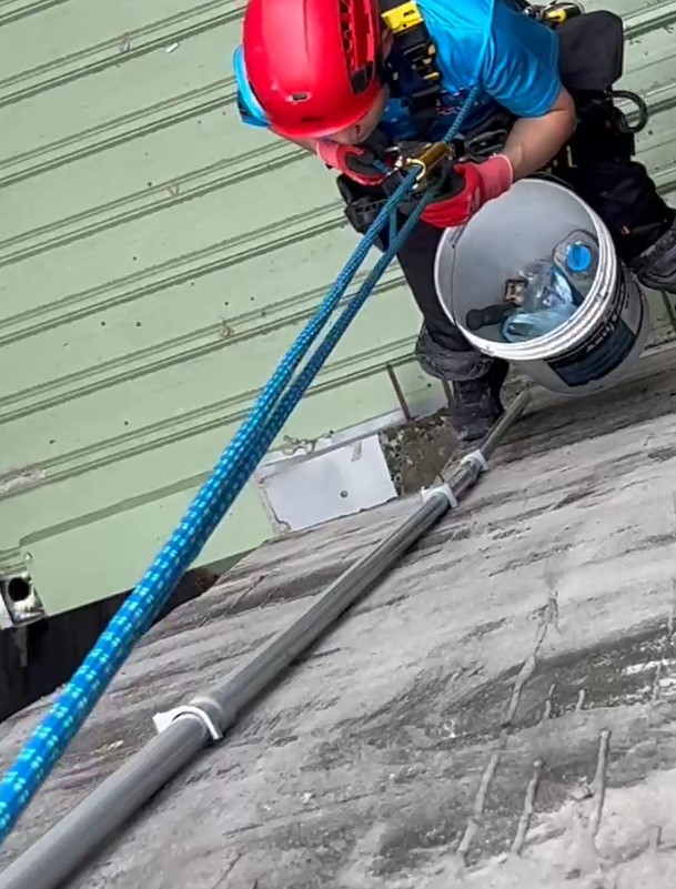 抓漏魔術師團隊運用「蜘蛛人」高空作業技術,成功克服困難,精準執行外牆防水工程與屋外配水管安裝,確保建築物長久防水、穩固耐用。
