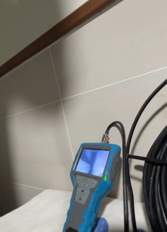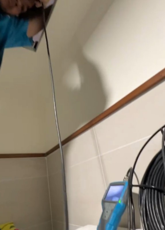 現場技師立即啟用高解析工業內視鏡探頭,從吊隱天花板的檢修孔深入排水與給水系統,逐段檢查每一寸管路的狀況。內視鏡就像醫生的眼睛,能穿梭在狹窄的管道中,清楚拍下破損、滲水、接頭老化等細節。經過仔細排查,我們在冷水管與排水管交接處,發現一小段接頭密合不良,並有水痕沿管壁下滲,正是導致天花板持續受潮的元兇。